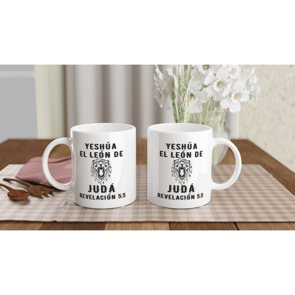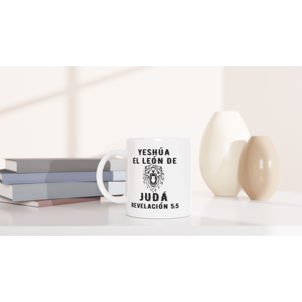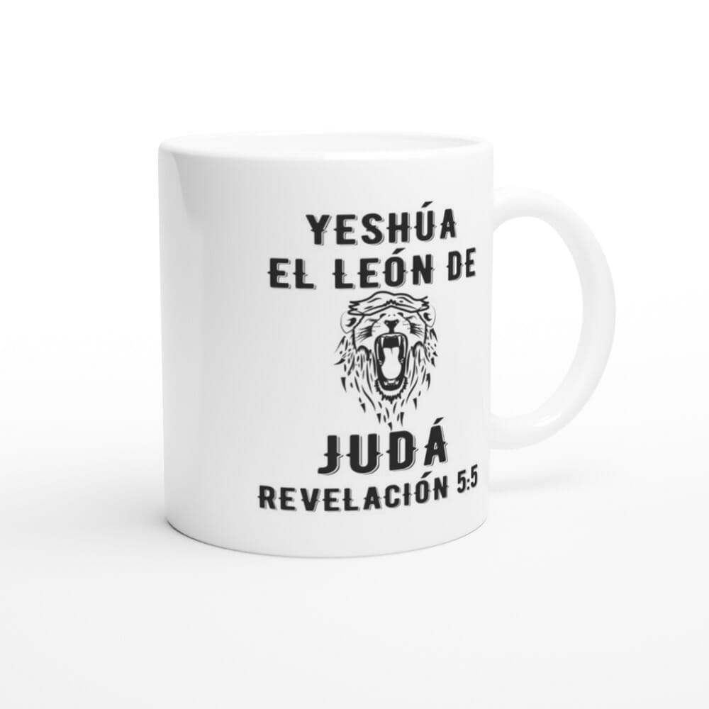 Esta hermosa taza de cerámica blanca muestra el mensaje «Yeshúa el león de Judá», inspirada en Revelaciones 5:5
